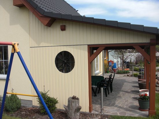 geschleppte Hausdachverlängerung mit Holzschutzfarbe passend zur Fassade